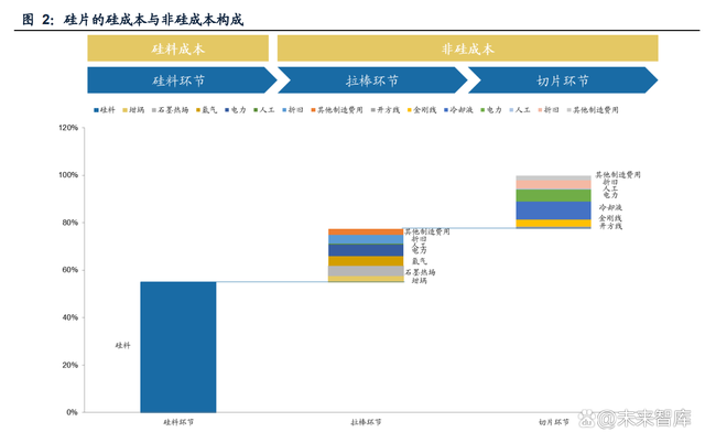 從不同環(huán)節(jié)的成本構(gòu)成,可總結(jié)出硅片主要的降本路徑:(1)降低硅料成本:當(dāng)前 硅料價(jià)格處于高位,企業(yè)一般通過長單鎖定硅料。但硅料成本在硅片環(huán)節(jié)中占比較 高,達(dá)55%以上,屬于較為剛性的部分,更有效的降本方式為通過硅片薄片化、金剛 線細(xì)線化等來攤薄單片硅耗;(2)降低非硅成本(拉棒環(huán)節(jié)和切片環(huán)節(jié)):降低單 晶爐、截?cái)鄼C(jī)、開方機(jī)等設(shè)備折舊成本,熱場系統(tǒng)、金剛線等耗材成本,以及電耗成 本等,可通過規(guī)模效應(yīng)、技術(shù)改善、提升自動(dòng)化程度等手段實(shí)現(xiàn)。過去降本更多降的 是非硅成本,但隨著時(shí)間推移,非硅成本的降本空間越來越有限,隆基2021年的非 硅成本同比僅降低了7%??梢灶A(yù)計(jì),未來降低硅料成本的技術(shù)手段的重要性將愈發(fā) 凸顯。