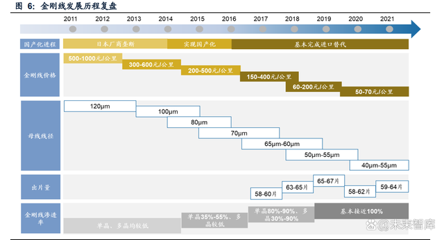 細(xì)線化是金剛線的長期發(fā)展趨勢。金剛線在光伏切片應(yīng)用領(lǐng)域經(jīng)歷了10年發(fā)展歷程, 目前在單晶切片和多晶切片的滲透率都達(dá)到了100%。金剛線滲透率提升的動(dòng)力主要 來自兩個(gè)方面:一是國產(chǎn)化和規(guī)模化生產(chǎn)所帶來的價(jià)格快速下降,使得金剛線得以 大規(guī)模運(yùn)用推廣;二是細(xì)線化帶來的出片量提升,從而降低單片硅耗,導(dǎo)致下游需 求快速增長。隨著硅料價(jià)格高企、硅片向大尺寸化和薄片化演進(jìn),細(xì)線化已成為金 剛線未來的長期發(fā)展趨勢。
