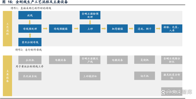 金剛線是一種線形超硬材料切割工具,結(jié)構(gòu)包括母線基體、鎳鍍層、金剛石微粉顆 粒,主要生產(chǎn)工藝流程為:用電鍍的方法在鋼線基體上沉積一層金屬鎳,金屬鎳層 內(nèi)包裹有金剛石顆粒,使金剛石顆粒固結(jié)在鋼線基體上。 金剛石線下游應(yīng)用于光伏領(lǐng)域的需求占比超過90%??捎糜诠璋艚?cái)?、硅錠開方、 硅片切割。金剛線切割的原理為,金剛線壓在硅材料表面,固結(jié)在鋼線基體上的金 剛石顆粒在鋼線帶動(dòng)下快速移動(dòng),產(chǎn)生磨削效果,磨去部分硅料,形成“刀縫”,從 而達(dá)到切割的目的。