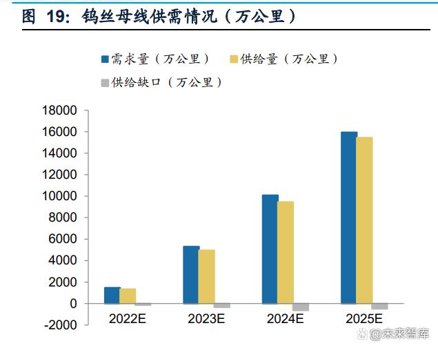 測算結(jié)果顯示,2022-2025年金剛線需求量可達(dá)到1.47/1.77/2.02/2.28億公里,市場 空間57/62/64/65億元;對(duì)應(yīng)的鎢絲母線需求量為0.15/0.53/1.00/1.59億公里,市場空 間5.29/17.16/29.39/41.83億元,增速顯著超過金剛線,需求較為旺盛。由于兩大鎢 絲龍頭產(chǎn)能釋放需要一定周期,預(yù)計(jì)市場將出現(xiàn)供給缺口。